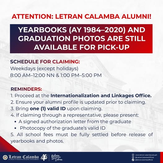 To all Letranistas who have not yet claimed their yearbooks and graduation photos, kindly secure your copies at the Internationalization and Linkages Office.