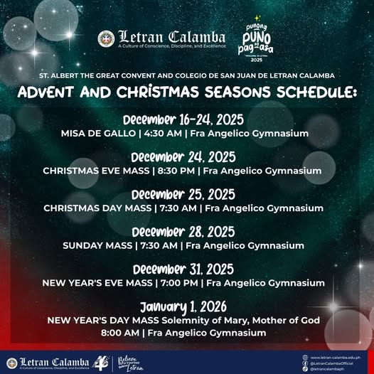 Let us prepare our hearts for the coming of our Savior. The St. Albert the Great Convent and Colegio de San Juan de Letran Calamba invite everyone to join our Simbang Gabi and Christmas season masses at the Fra Angelico Gymnasium.