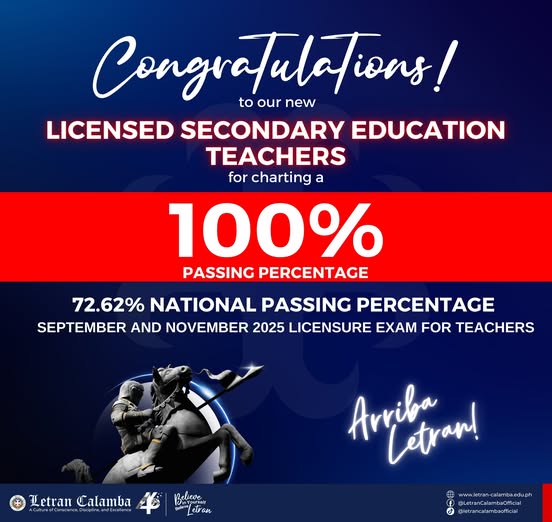 Colegio de San Juan de Letran Calamba is proud to announce a 100% passing rate in the November 2025 Nursing Licensurโฆ