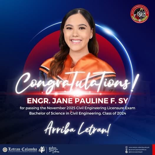 Letran Calamba Congratulates Engr. Jane Pauline F. Sy on Passing the Civil Engineering Board Exam