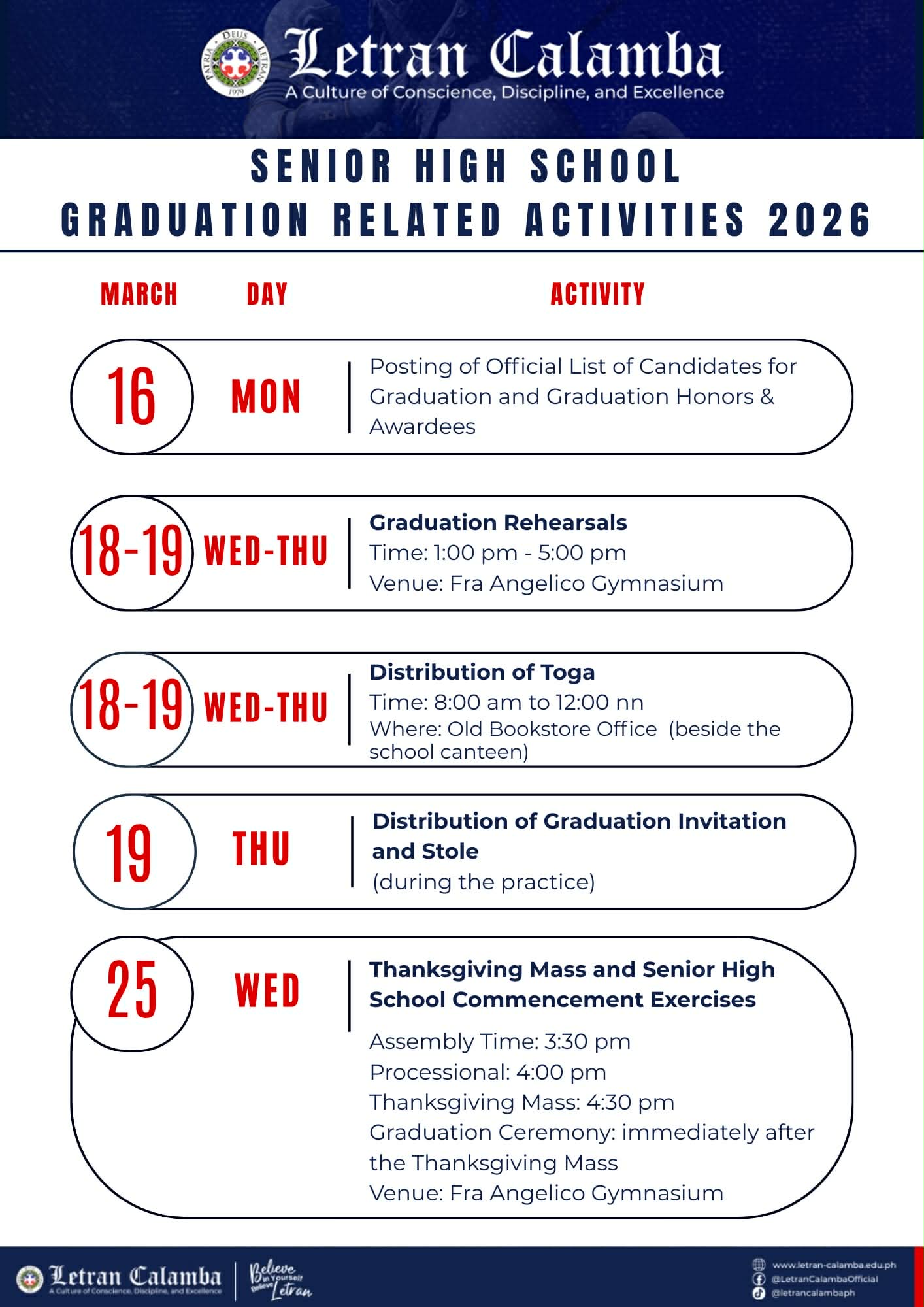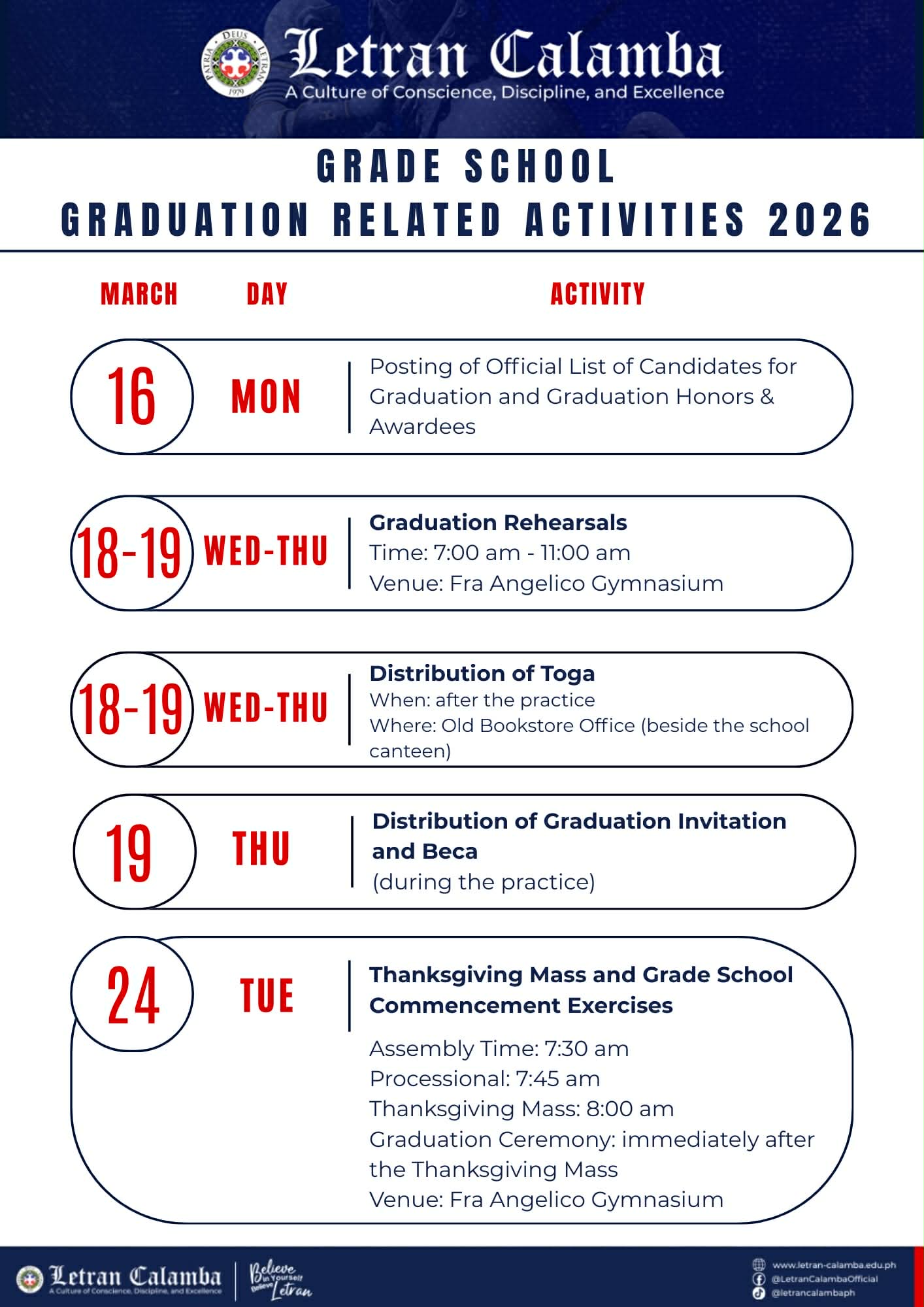 To our Grade School and Senior High School students, please take note of these important dates for your graduation-related activities this March.