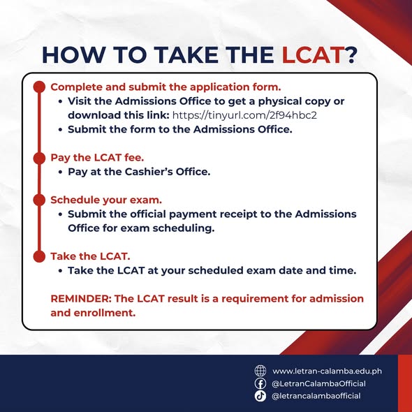 REMINDER: The LCAT result is a requirement for admission and enrollment.