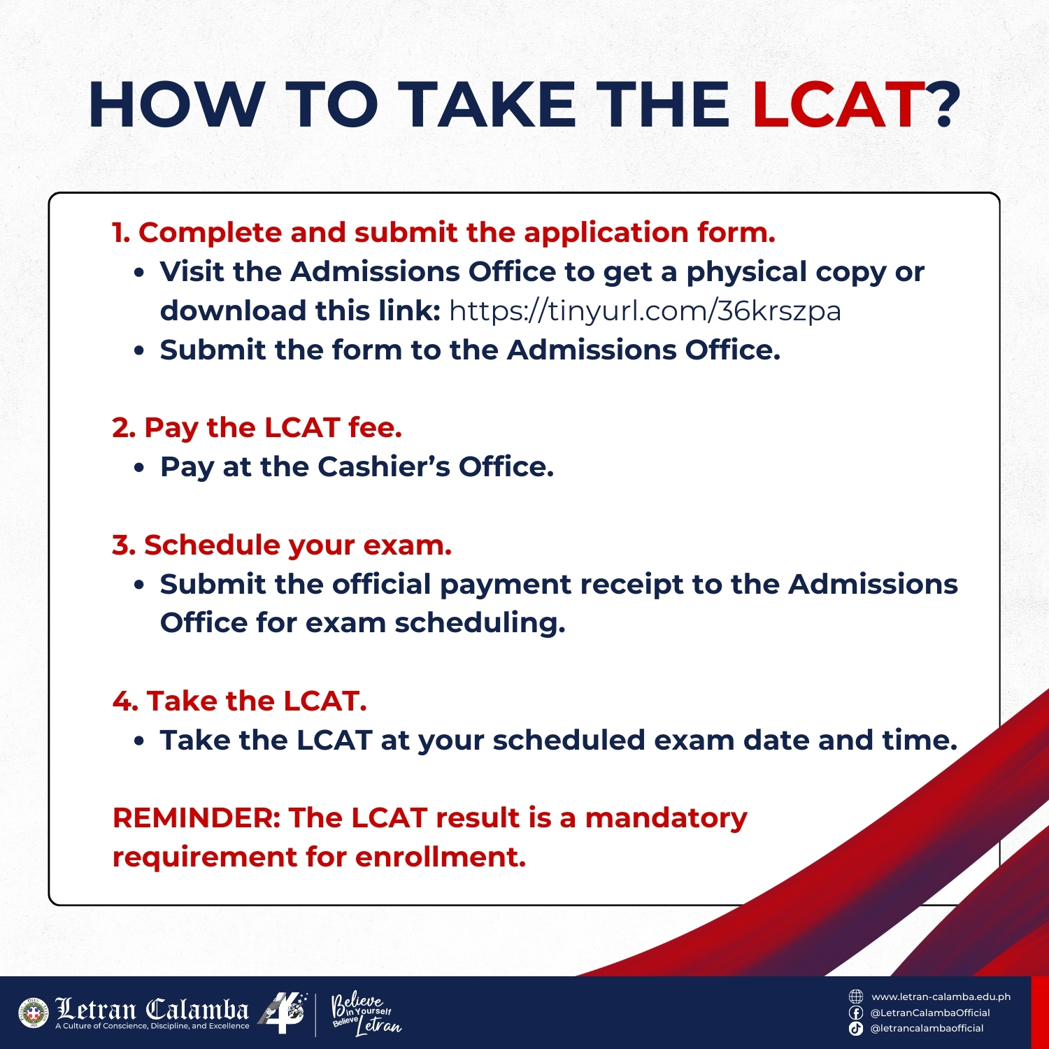 Ready to start your journey with Letran Calamba? Take the first step by securing your Letran Calamba Admissions Test (LCAT) schedule.