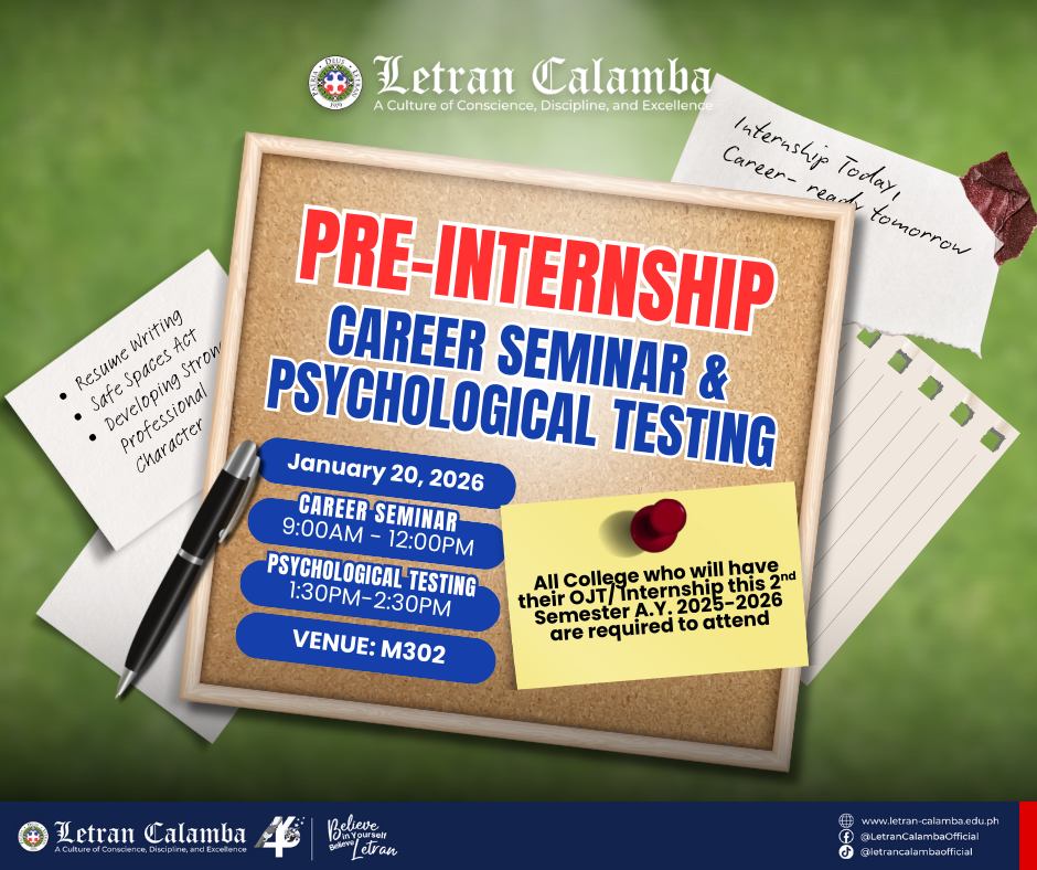 Make sure to mark your calendars for the Pre-Internship Career Seminar and Psychological Testing on January 20, 2026 (Tuesday).