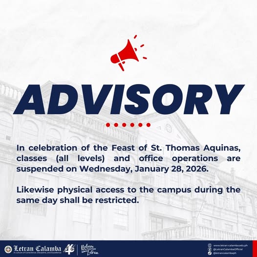 In celebration of the Feast of St. Thomas Aquinas, 28 January, 2026, Wednesday, please be advised that classes in all levels (both synchronous and asynchronous), as well as work and office operations in the Colegio will be suspended.
