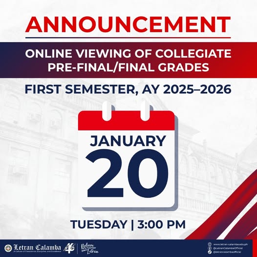 The First Semester, AY 2025–2026 Pre-final and Final grades will be available for online viewing starting this coming Tuesday. Please take note of the schedule below:
