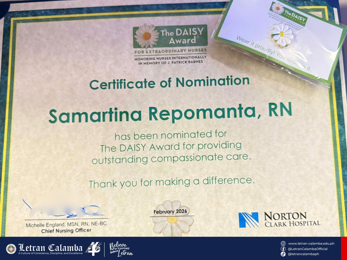 The Colegio de San Juan de Letran Calamba - School of Nursing stands in proud salute to our alumna, Ms. Samartina Clara Repomanta, RN, MSN (Batch 2012), for her prestigious nomination for The DAISY Award at Norton Clark Hospital in Indiana, USA!