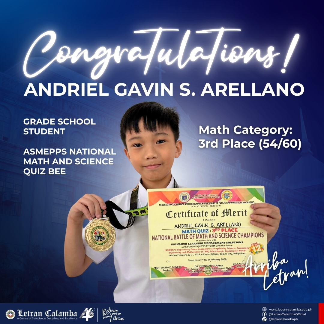 Huge kudos to Caleb Izek Marquez (2nd Place) and Andriel Gavin Arellano (3rd Place) for their winning streaks at the Association of Science and Mathematics Educators of Public and Private Schools (ASMEPPS) National Math and Science Quiz Bee. Your excellence and perseverance inspire us all!