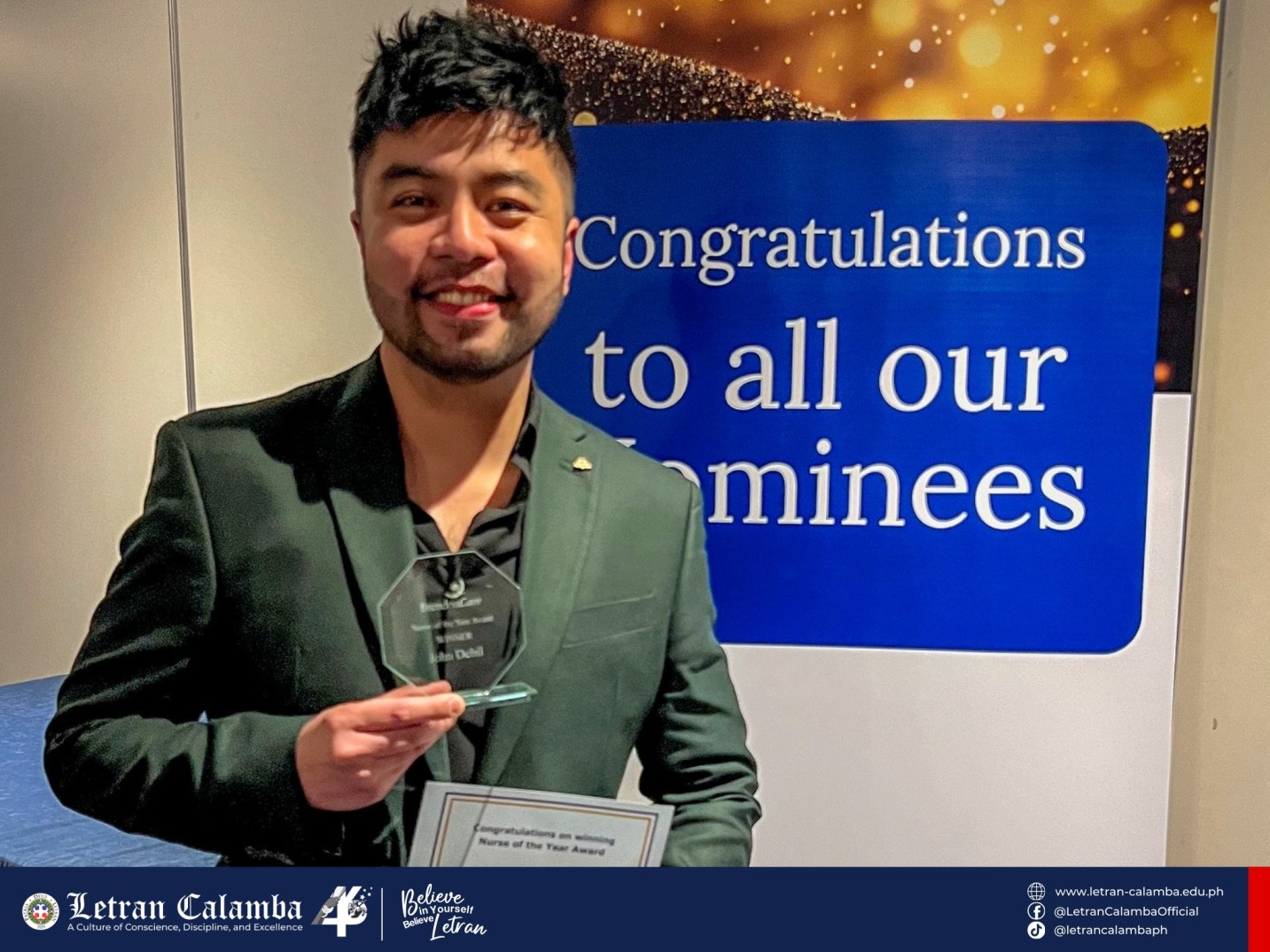 John Ryan, your dedication to the nursing profession and your commitment to excellence embody the true heart of a Letranite. You have not only brought honor to your alma mater but have also showcased the world-class caliber of Filipino nurses on the global stage.