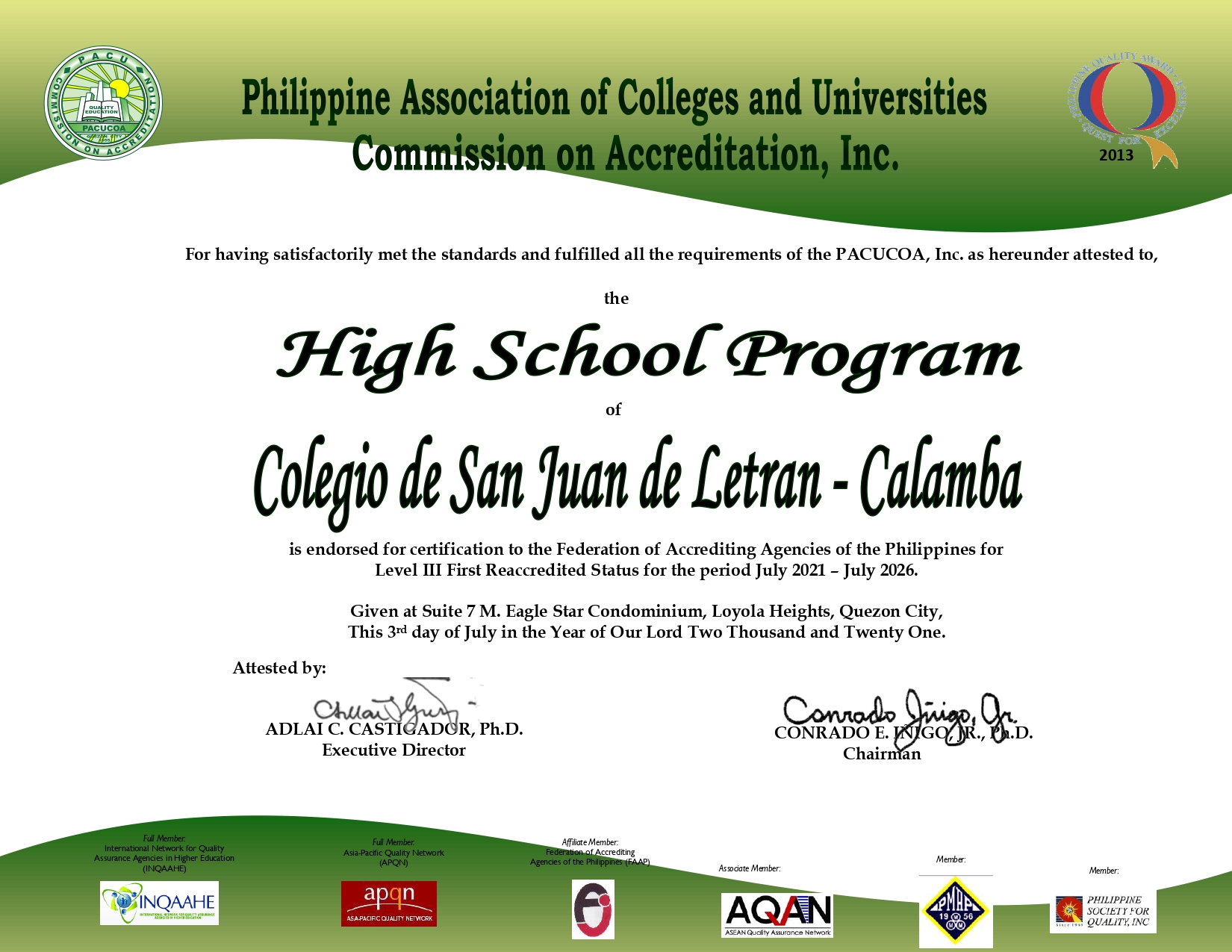 FAAP & PACUCOA LEVEL III 1ST REACCRE LSHS JUNE 2021-JULY 2026