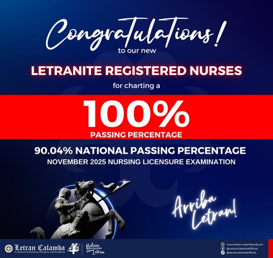 Letran Calamba secures a ๐ญ๐ฌ๐ฌ% ๐ฃ๐ฎ๐๐๐ถ๐ป๐ด ๐ฃ๐ฒ๐ฟ๐ฐ๐ฒ๐ป๐๐ฎ๐ด๐ฒ in the November 2025 Nursing Licensure Exam! A testament to the excโฆ