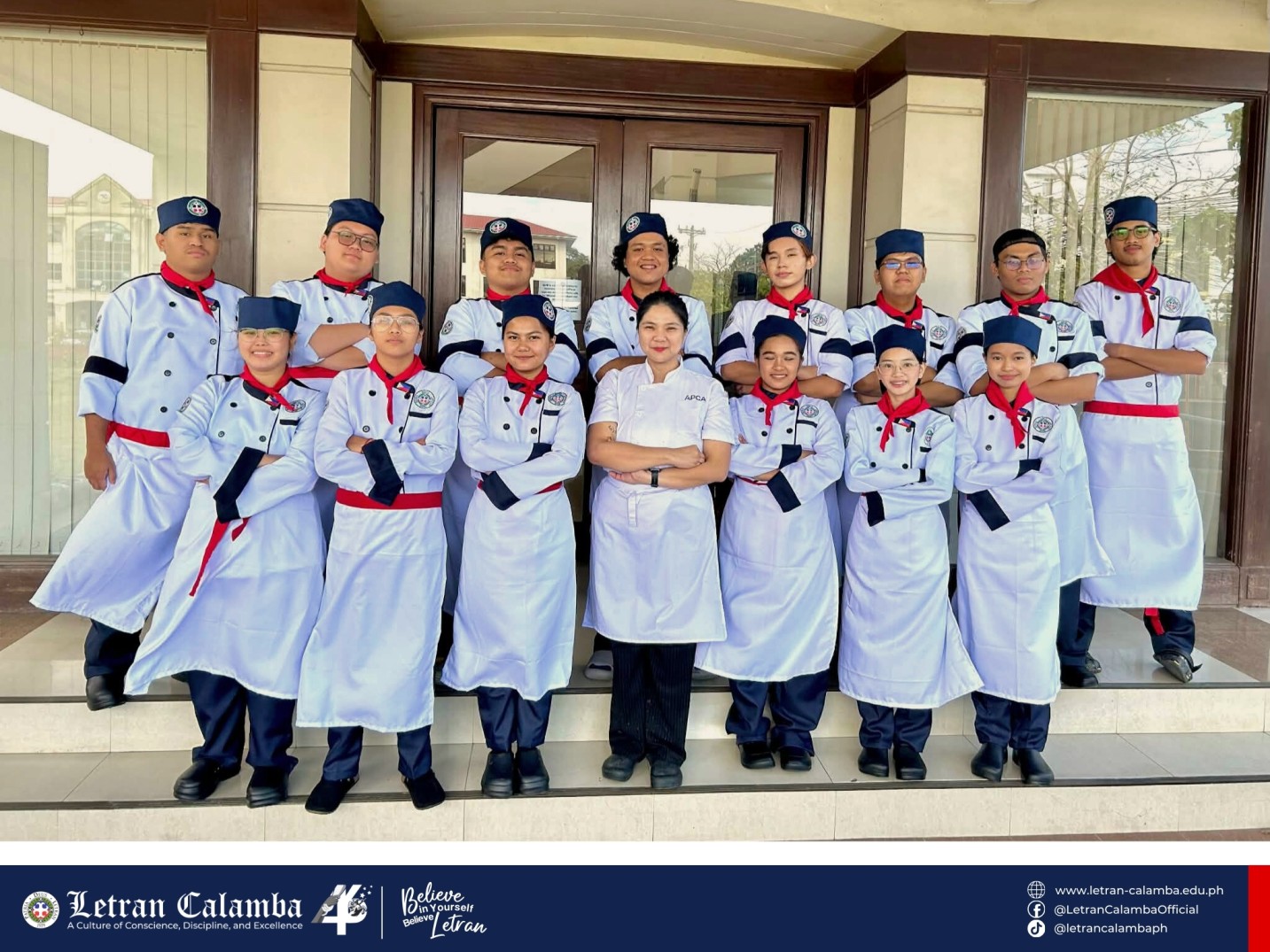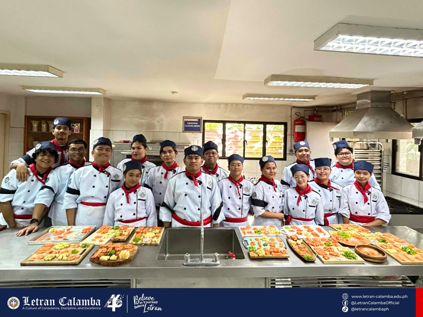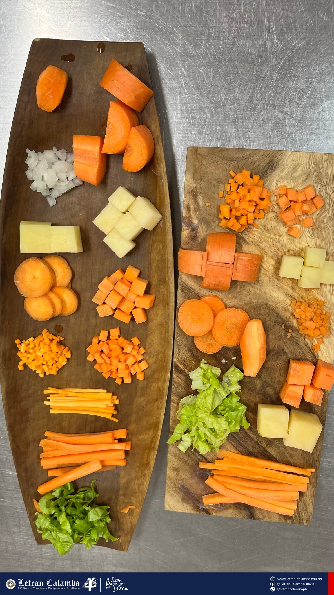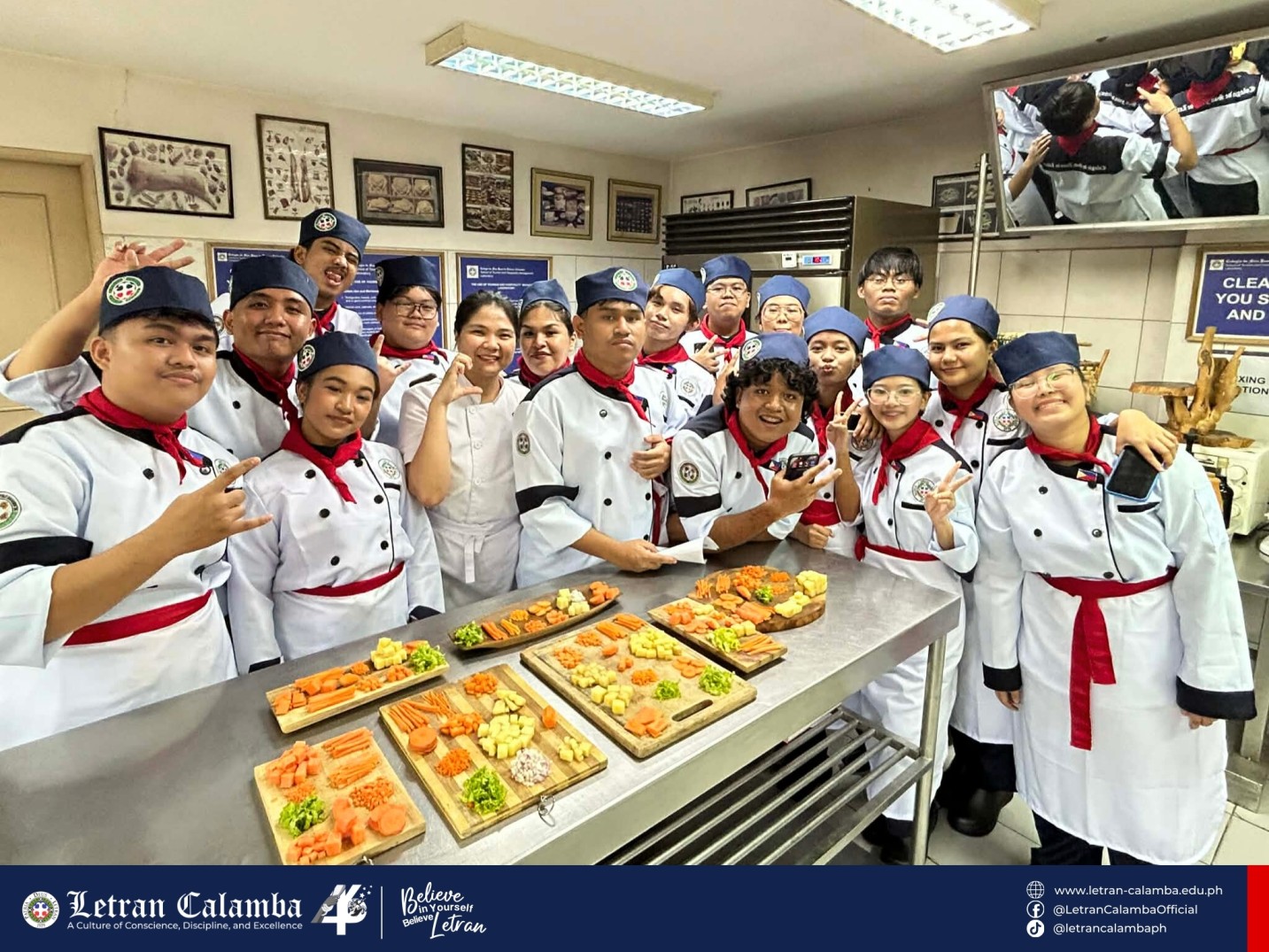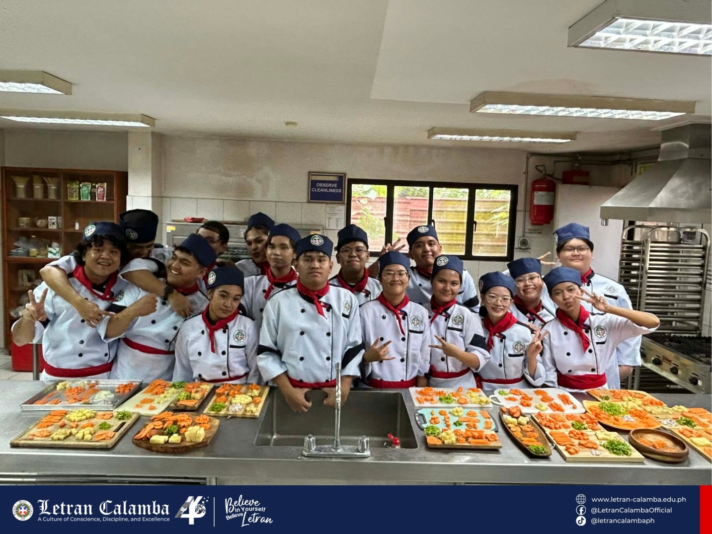 Day 01 in the kitchen! Our 𝟭𝘀𝘁 𝗬𝗲𝗮𝗿 𝗛𝗼𝘀𝗽𝗶𝘁𝗮𝗹𝗶𝘁𝘆 𝗠𝗮𝗻𝗮𝗴𝗲𝗺𝗲𝗻𝘁 𝘀𝘁𝘂𝗱𝗲𝗻𝘁𝘀 are officially trading pens for chef’s knives. Today’s mission: Mastering the art of the cut with 𝐌𝐬. 𝐊𝐂 𝐋𝐚𝐭 in Kitchen Essentials and Basic Food Preparation.