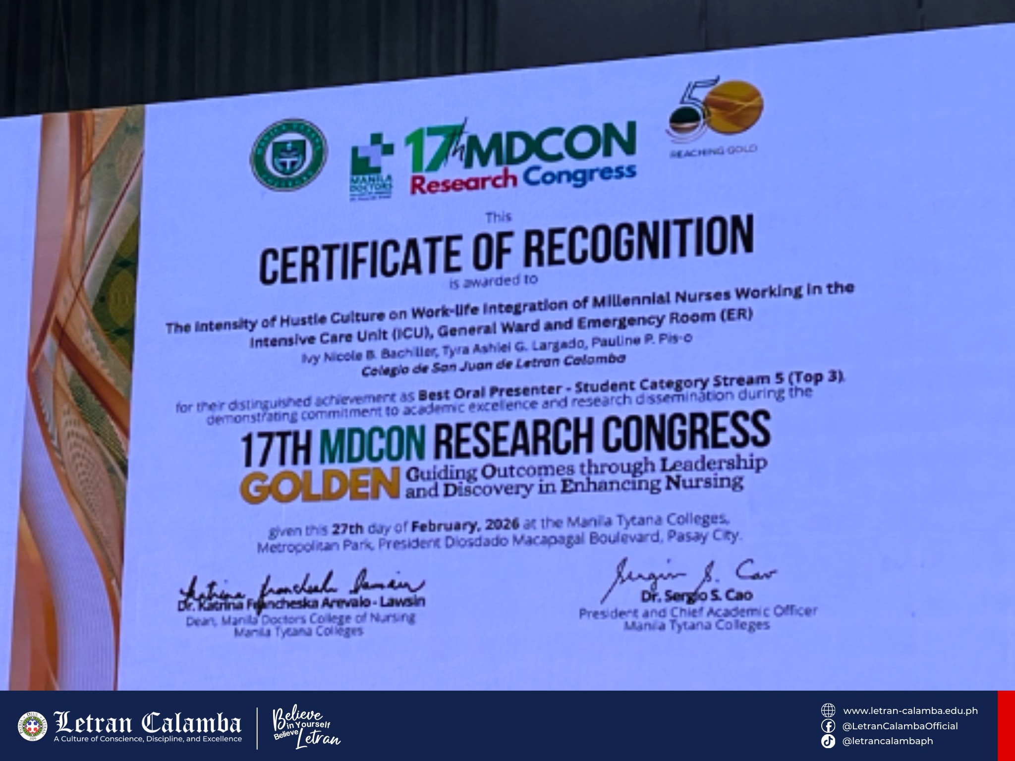 The Colegio de San Juan de Letran Calamba School of Nursing demonstrated that its students are truly research-ready, actively participating in the 𝟭𝟳𝘁𝗵 𝗠𝗮𝗻𝗶𝗹𝗮 𝗗𝗼𝗰𝘁𝗼𝗿𝘀 𝗖𝗼𝗹𝗹𝗲𝗴𝗲 𝗼𝗳 𝗡𝘂𝗿𝘀𝗶𝗻𝗴 (𝗠𝗗𝗖𝗢𝗡) 𝗥𝗲𝘀𝗲𝗮𝗿𝗰𝗵 𝗖𝗼𝗻𝗴𝗿𝗲𝘀𝘀 𝗵𝗲𝗹𝗱 𝗳𝗿𝗼𝗺 𝗙𝗲𝗯𝗿𝘂𝗮𝗿𝘆 𝟮𝟲 𝘁𝗼 𝟮𝟳, 𝟮𝟬𝟮𝟲.