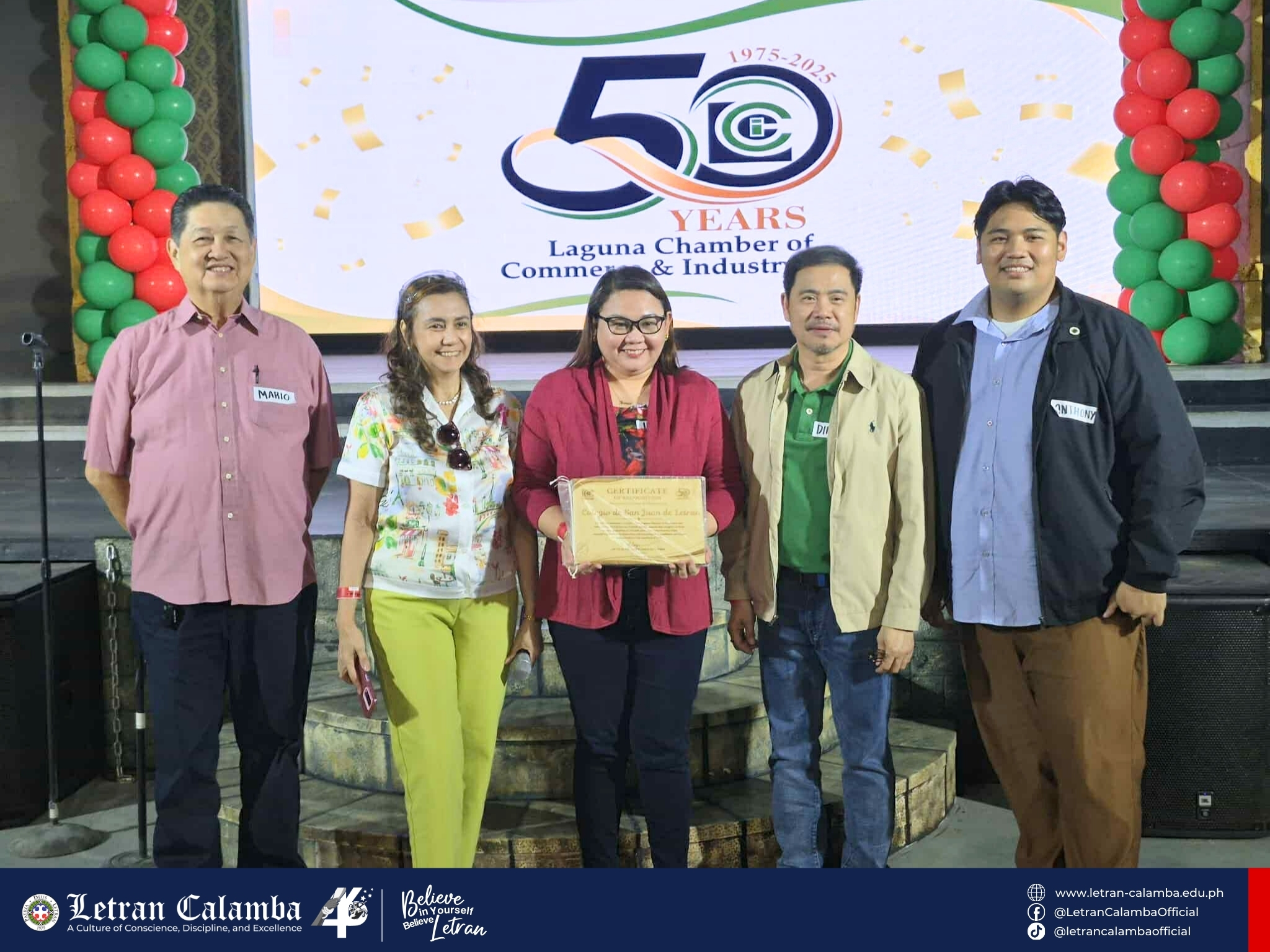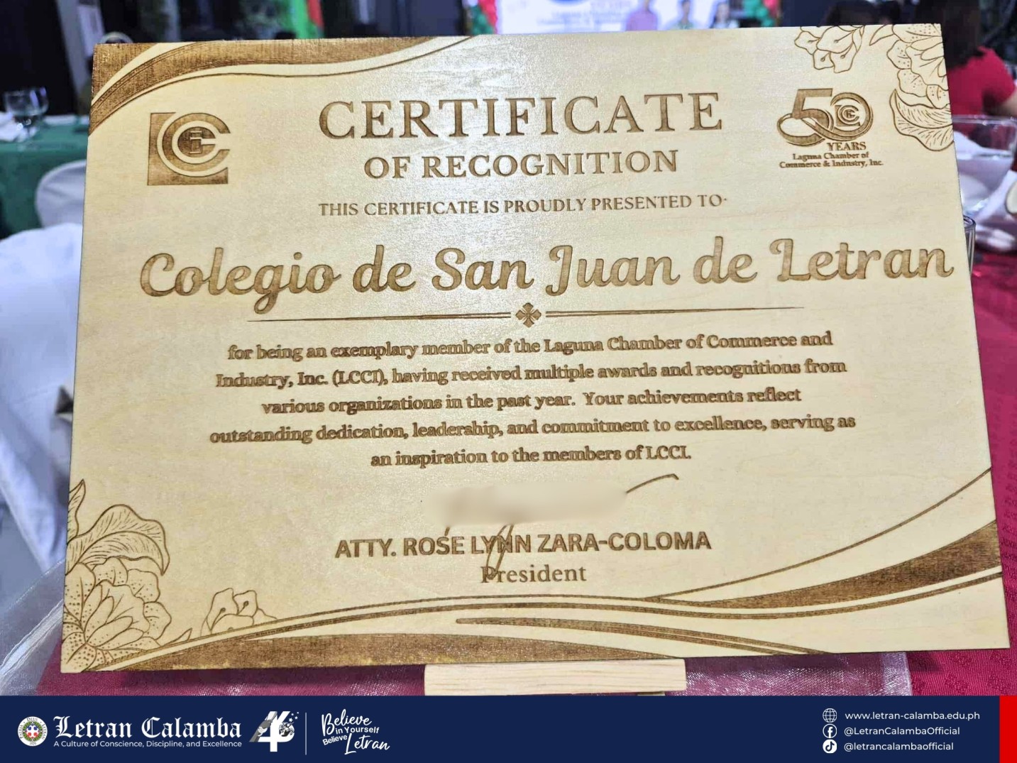 Colegio de San Juan de Letran Calamba is honored to an exemplary member award from the Laguna Chamber of Commerce and Industry, Inc. (LCCI), a recognition given to organizations that have earned multiple awards and distinctions throughout the year.