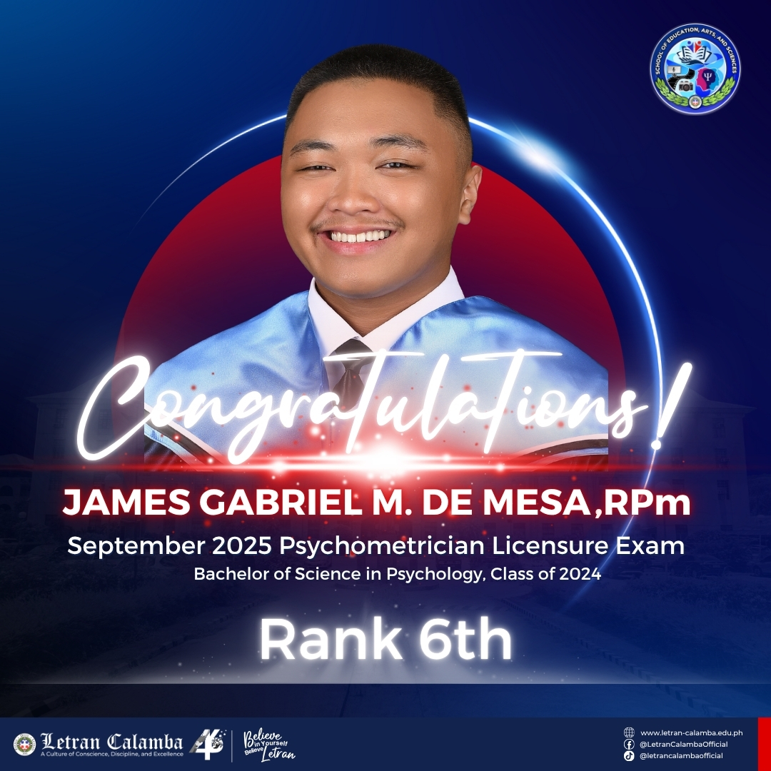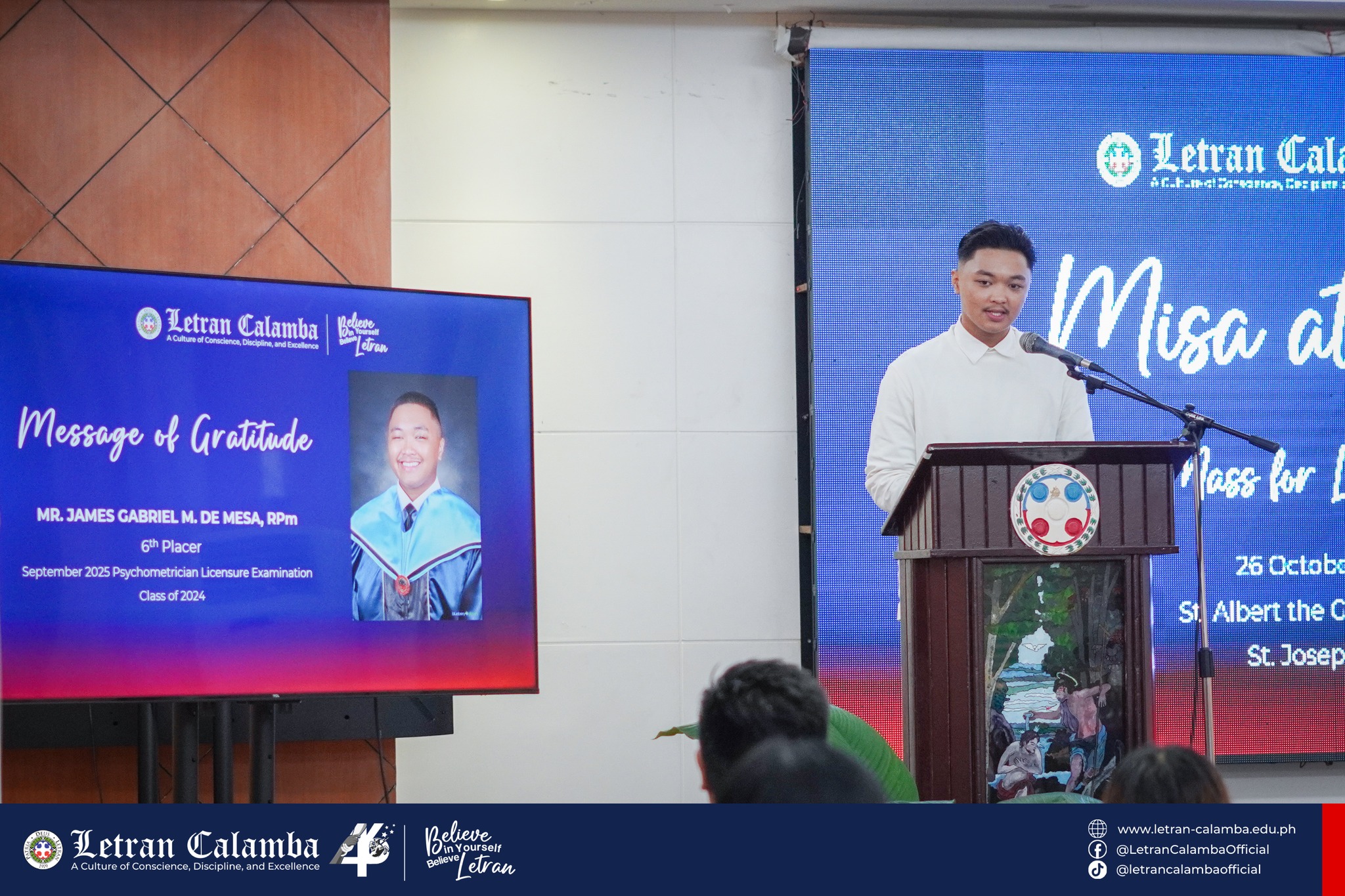 The St. Albert the Great Chapel of Colegio de San Juan de Letran Calamba was alive with gratitude, inspiration, and a palpable sense of achievement on October 26, 2025, as the community gathered to celebrate one of its brightest alumni. The occasion was truly remarkable: Mr. James Gabriel M. De Mesa, 6th Placer Nationwide in the September 2025 Psychometrician Licensure Examination, was publicly recognized for his outstanding accomplishment.