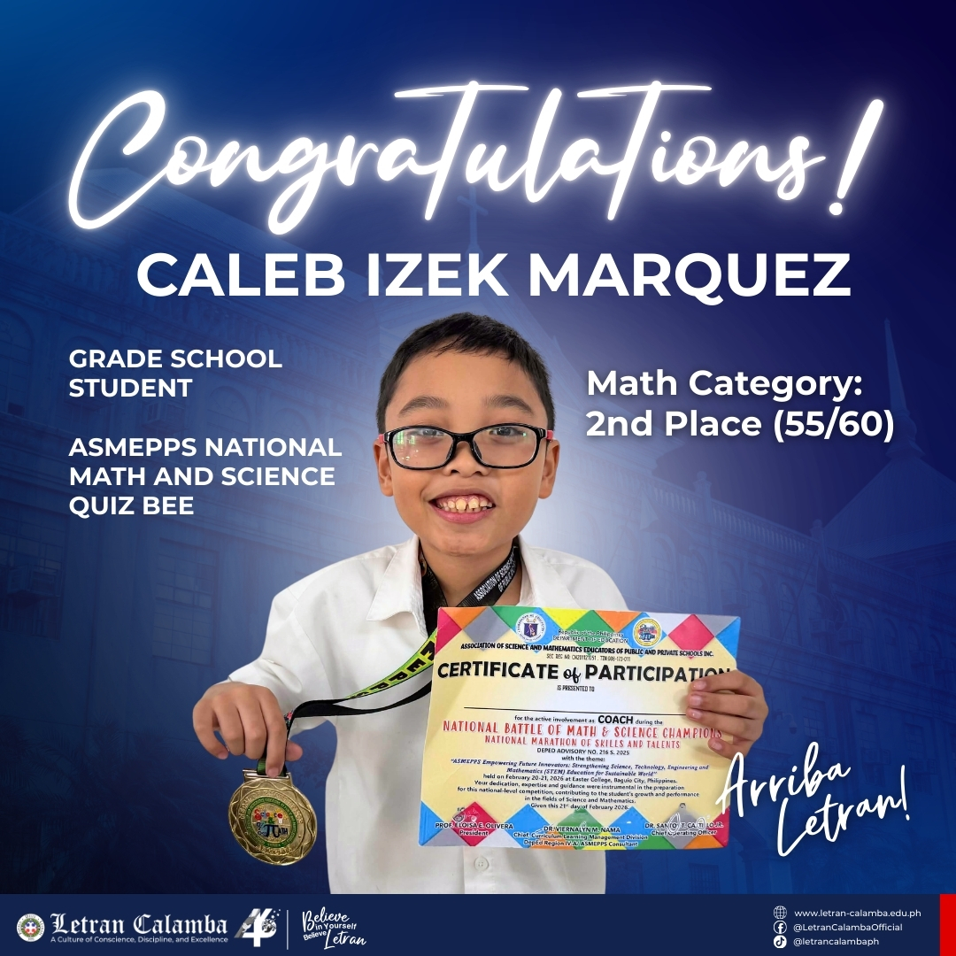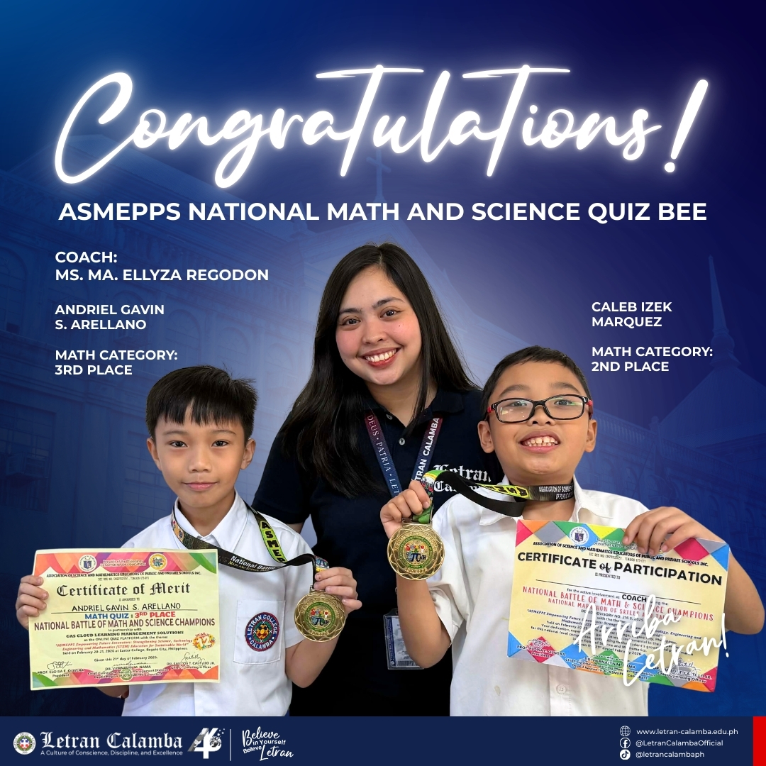 Huge kudos to Caleb Izek Marquez (2nd Place) and Andriel Gavin Arellano (3rd Place) for their winning streaks at the Association of Science and Mathematics Educators of Public and Private Schools (ASMEPPS) National Math and Science Quiz Bee. Your excellence and perseverance inspire us all!